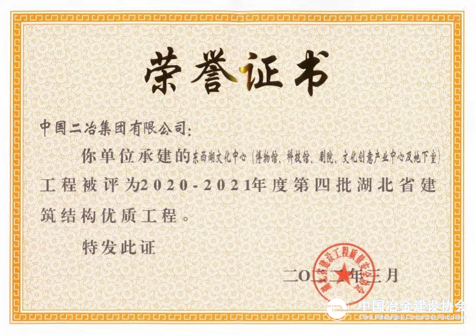 4月10日,中國二冶收到湖北省建筑工程質(zhì)量安全協(xié)會“2020-2021年度第四批湖北省建筑結(jié)構(gòu)優(yōu)質(zhì)工程”榮譽證書,由中國二冶承建的武漢東西湖文化中心項目獲評“湖北省結(jié)構(gòu)優(yōu)質(zhì)工程獎”。