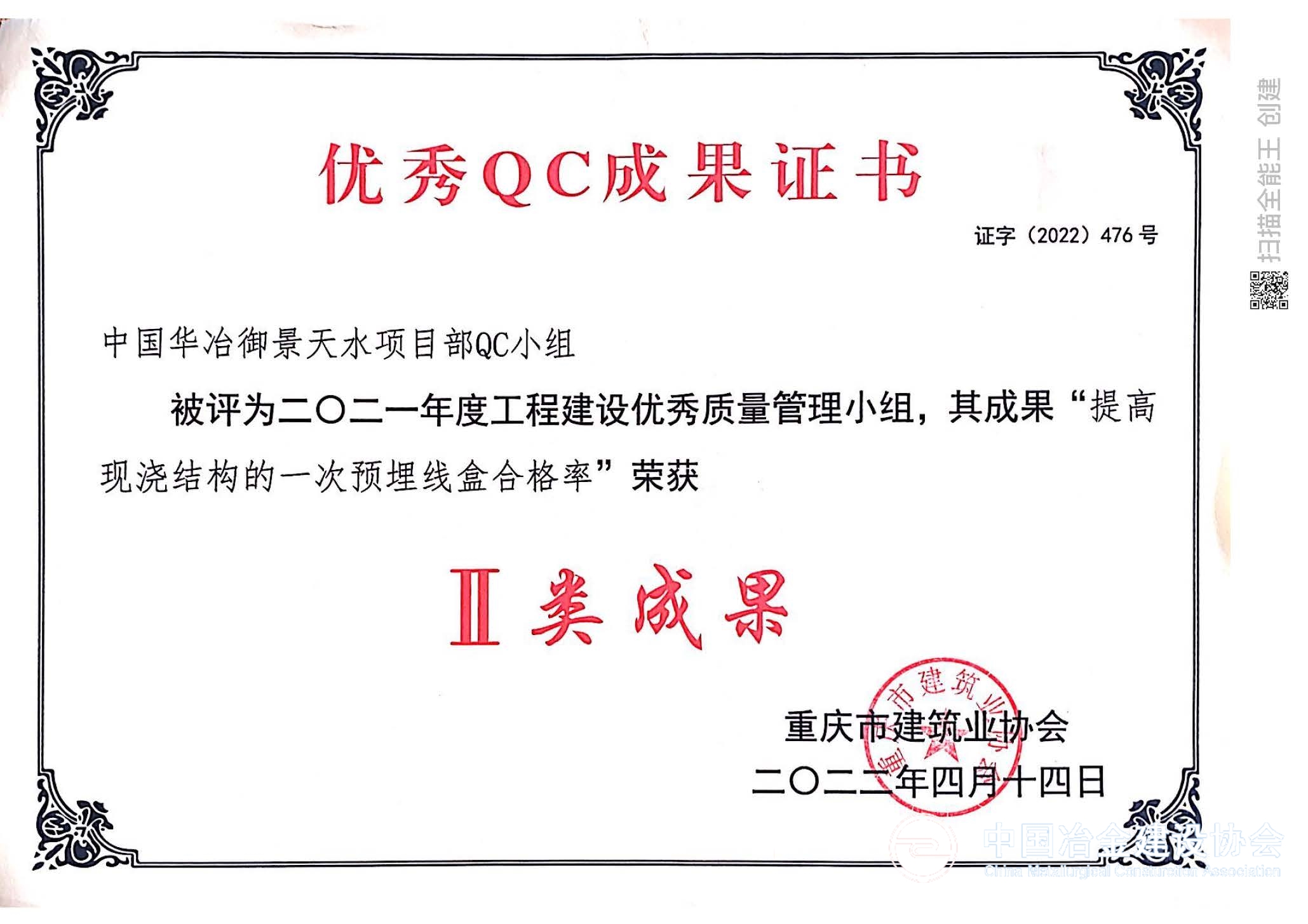 近日,中國(guó)華冶申報(bào)的《提高現(xiàn)澆結(jié)構(gòu)的一次預(yù)埋線盒合格率》《提高疊合板安裝合格率》2項(xiàng)QC成果,在重慶市建筑業(yè)協(xié)會(huì)舉辦的2021年度工程建設(shè)質(zhì)量管理小組大賽近900件優(yōu)秀成果中獲二類成果獎(jiǎng)。