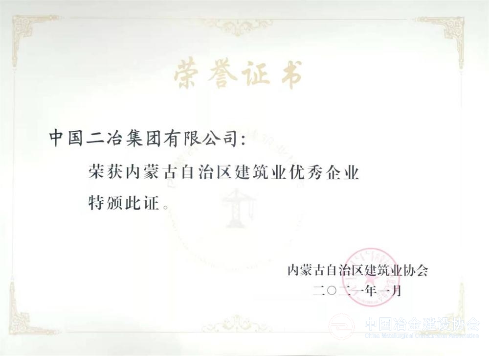 中國(guó)二冶榮獲“內(nèi)蒙古自治區(qū)建筑業(yè)優(yōu)秀企業(yè)”榮譽(yù)稱(chēng)號(hào)