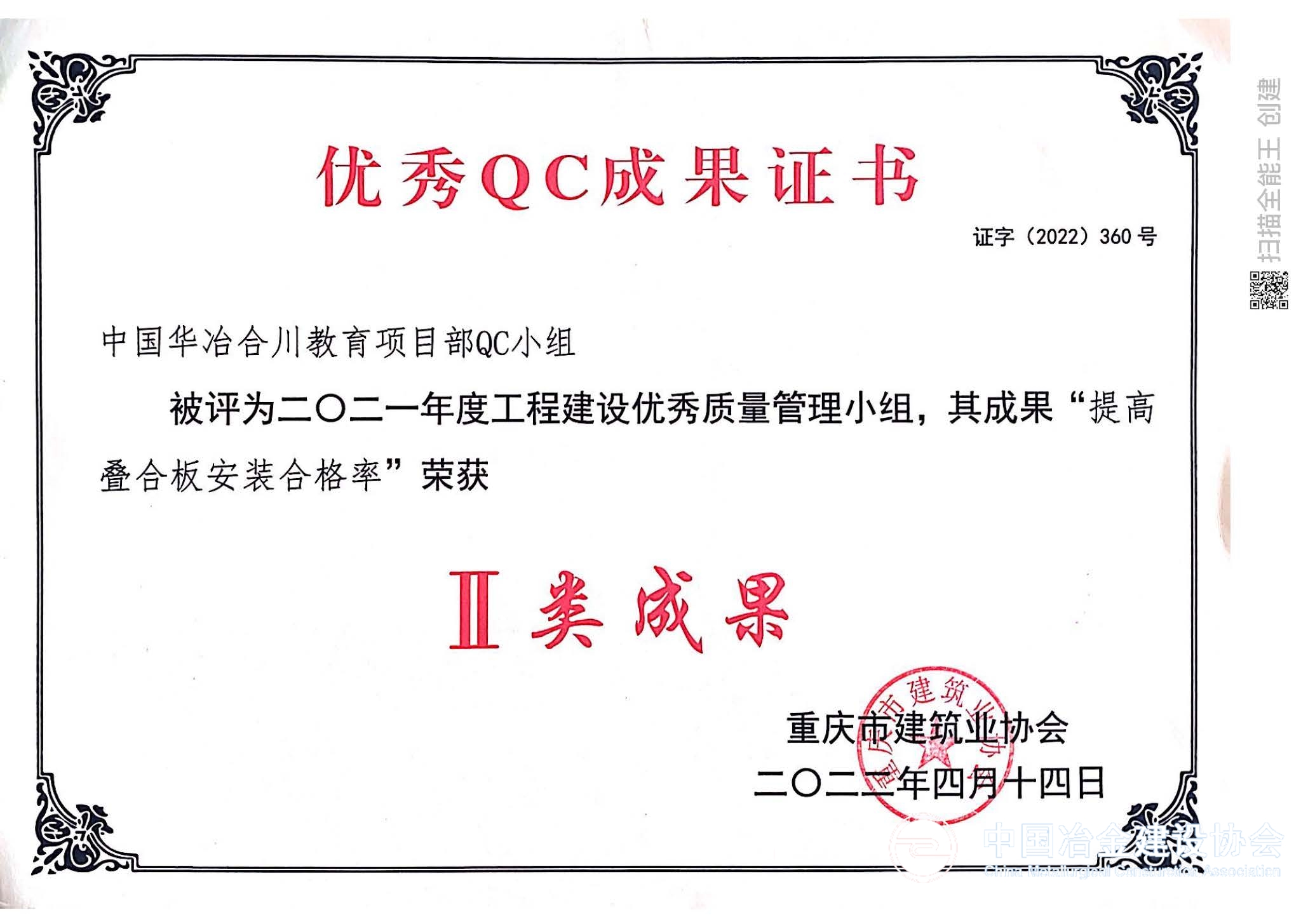 近日,中國(guó)華冶申報(bào)的《提高現(xiàn)澆結(jié)構(gòu)的一次預(yù)埋線盒合格率》《提高疊合板安裝合格率》2項(xiàng)QC成果,在重慶市建筑業(yè)協(xié)會(huì)舉辦的2021年度工程建設(shè)質(zhì)量管理小組大賽近900件優(yōu)秀成果中獲二類成果獎(jiǎng)。